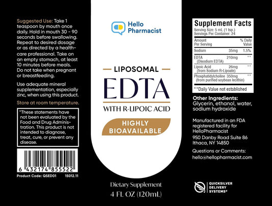 HelloPharmacist Liposomal EDTA with R-Lipoic Acid - 4 Oz Liquid - Quicksilver Delivery System Technology - Highly Bioavailable - 4 Oz (120mL)